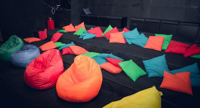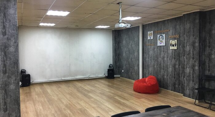 </p> <p>Если вы думаете, что в этом лофте белая стена нужна только для украшения, то вы ошибаетесь. От этой стены очень большая польза – она служит большим и ровным экраном для проектора. А еще здесь нет окон, а значит здесь с любое время дня и ночи отлично можно посмотреть любое видео. Звук выводится через ноутбук на большие колонки, так что и с этим проблем не будет. В наличии пуфы, стулья, диван, на которых могут комфортно разместиться 25-30 любителей кинопросмотров.