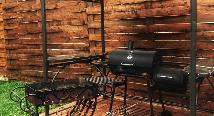 Большое пространство внутри и обустроенная площадка снаружи, подходит для большой компании. Возможна практически любая уличная кулинарная активность, поскольку  имеется и мангал, и барбекю. И то, и другое находится на улице. Приготовление возможно на углях, или дровах.  Есть навес для мангала и беседка рядом с ним для гостей. Можно поедать свежепожаренные вкусности прямо возле мангала, а можно переместится внутрь уютного пространства.