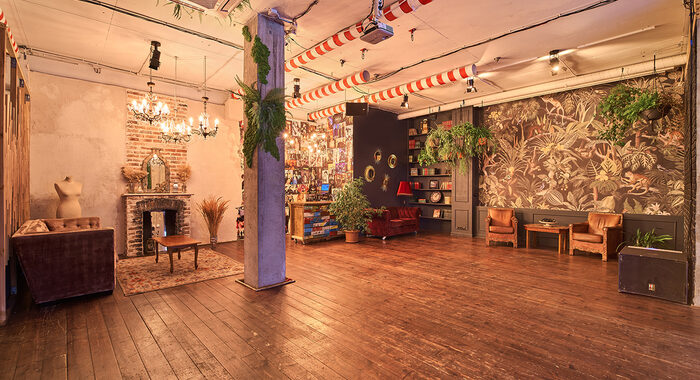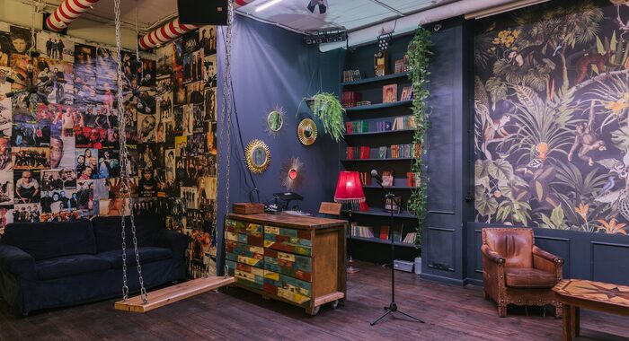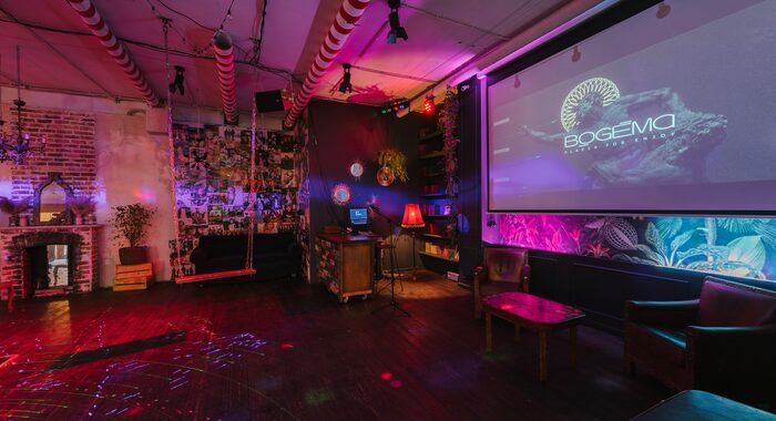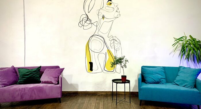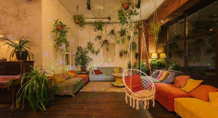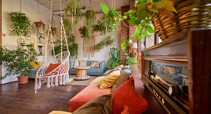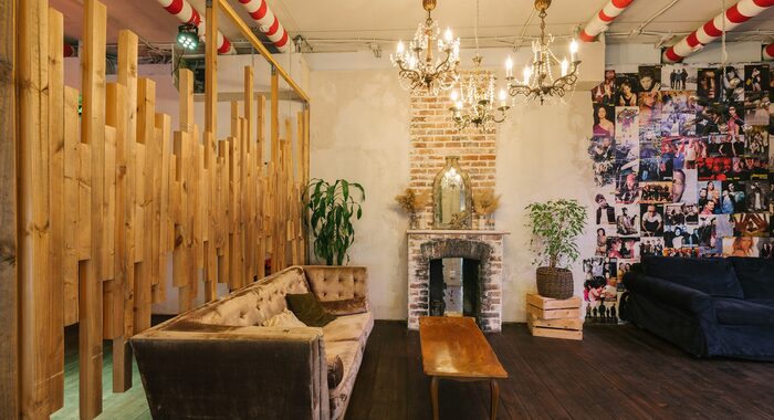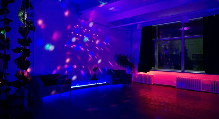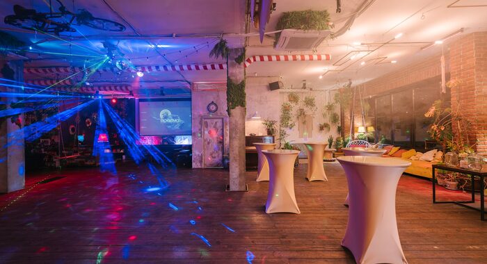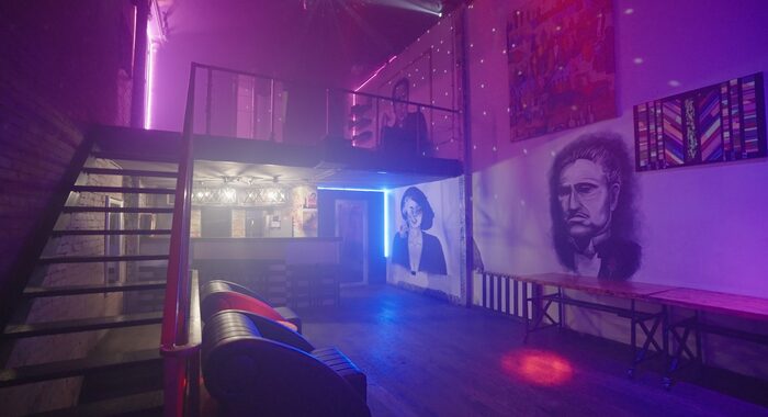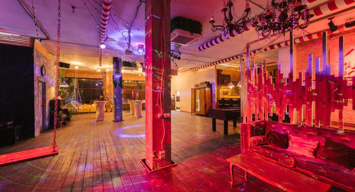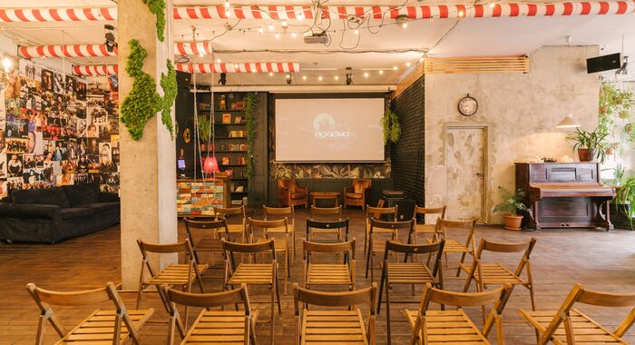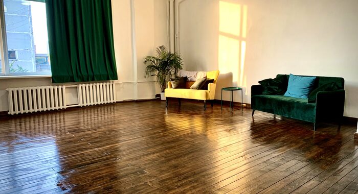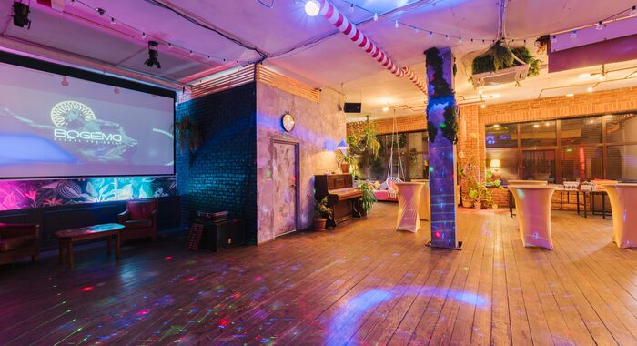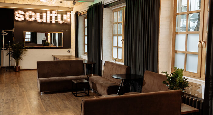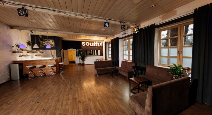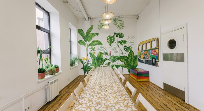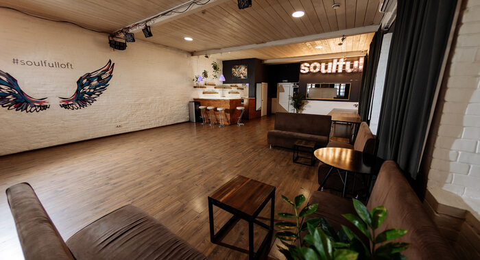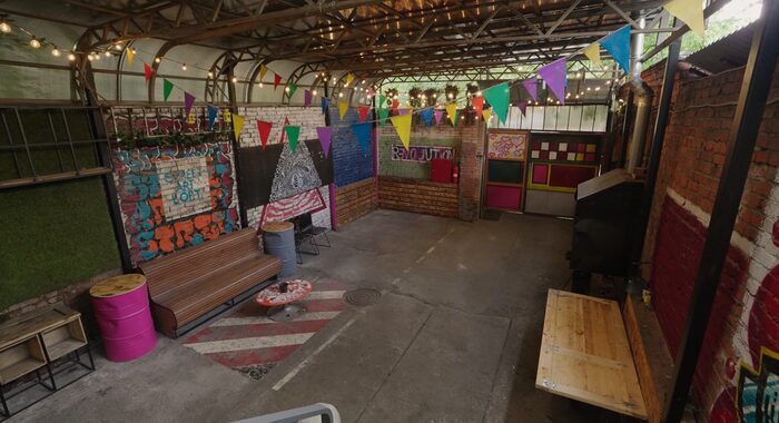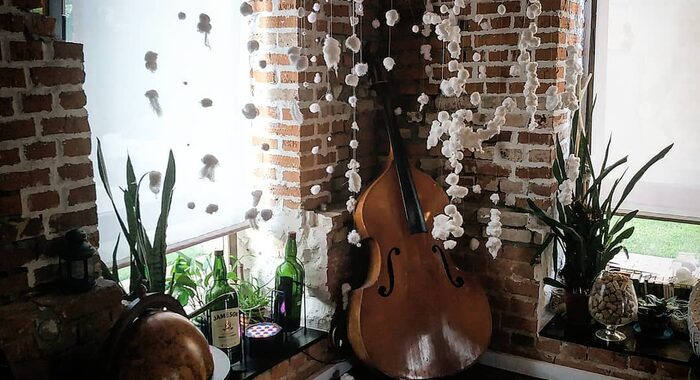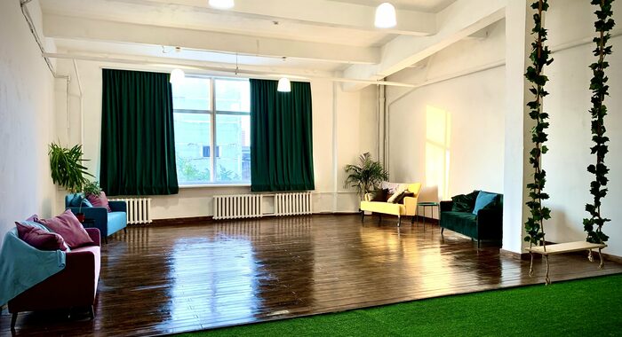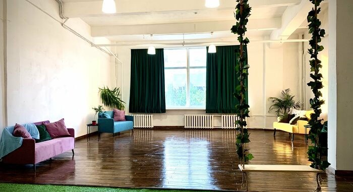 Очень яркое пространство в два этажа, в котором есть музыкальное оборудование, столы, стулья, диваны, растения. Есть парковка для гостей лофта во дворе. А для любителей шашлыка имеется угольный мангал. Аренда мангала здесь входит в стоимость аренды, стоит только заранее позаботиться об угле - либо привезти с собой, либо уточнить, есть ли достаточное количество угля в лофте. Это вариант для тех, кто любит готовить самостоятельно, поскольку повара здесь нет. Пространство на улице не оборудовано для посиделок, так что после приготовления еды, гостям и хозяевам будет удобнее переместиться обратно  в помещение и продолжить веселье и застолье там.