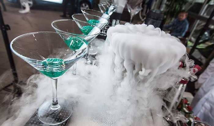Необычный вариант подачи напитков, который обеспечит вам, как бармену успех и уважение – подача с сухим льдом. Самый безопасный способ насыпать гранулы сухого льда в кулер-ведро или другую емкость и полить его горячей водой. Вас окутают клубы эффектного пара. Добавление сухого льда в стакан с напитком требует большего опыта, с этим лучше справится профессионал. Но если вы все же решились на эксперимент, запомните – в напиток можно положить только несколько гранул – коктейль будет красиво искриться, но подают такой напиток только со специальной трубочкой.