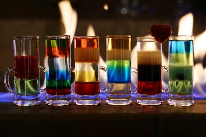Начинающему лучше ограничится двумя-четырьмя. Первый слой всегда самый плотный – это сиропы, сладкие ликеры, плотные пюре. Крепкие напитки всегда наверху. Чтобы определить, что за чем наливать в середине – посмотрите на этикетку напитка. Там часто указывают плотность или количество сахара. Чем больше сахара, тем ниже жидкость располагается в коктейльном «пироге». Наливать нужно очень аккуратно – лучше воспользоваться барной ложкой, но можно и по старинке лить по ножу.