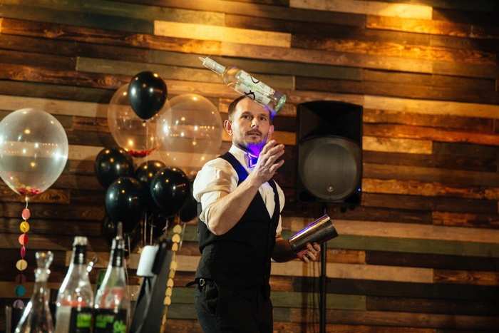 Жонглирование предметами несомненно разнообразит подачу напитков. И вы даже можете попробовать флейринг самостоятельно. Легче всего жонглировать фруктами или алюминиевыми банками. По крайней мере, это довольно безопасно, и, если даже что-то пойдет не так, будет просто смешно, но никто не пострадает. Из простенького можно также попробовать какие-то балансы со стаканом или шейкером на тыльной стороне руки или на локте.