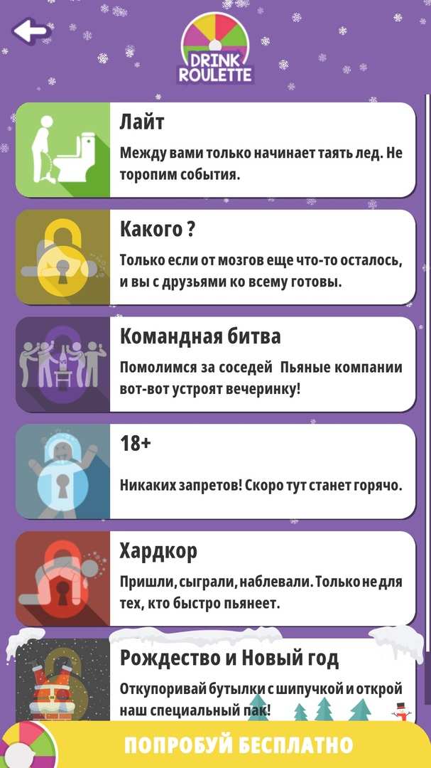 Если выпивать просто так вам и вашим гостям не интересно, да и вообще, вечеринка застопорилась, откройте развлекательные игровые алкоприложения. Например, drink roullet, рулетка, которая предлагает смешные задания для пары игроков или для компании. Задания либо связаны с выпивкой, либо предлагают накатить, если не можешь решить загадку или выполнить фант. AppStore и GooglePlay