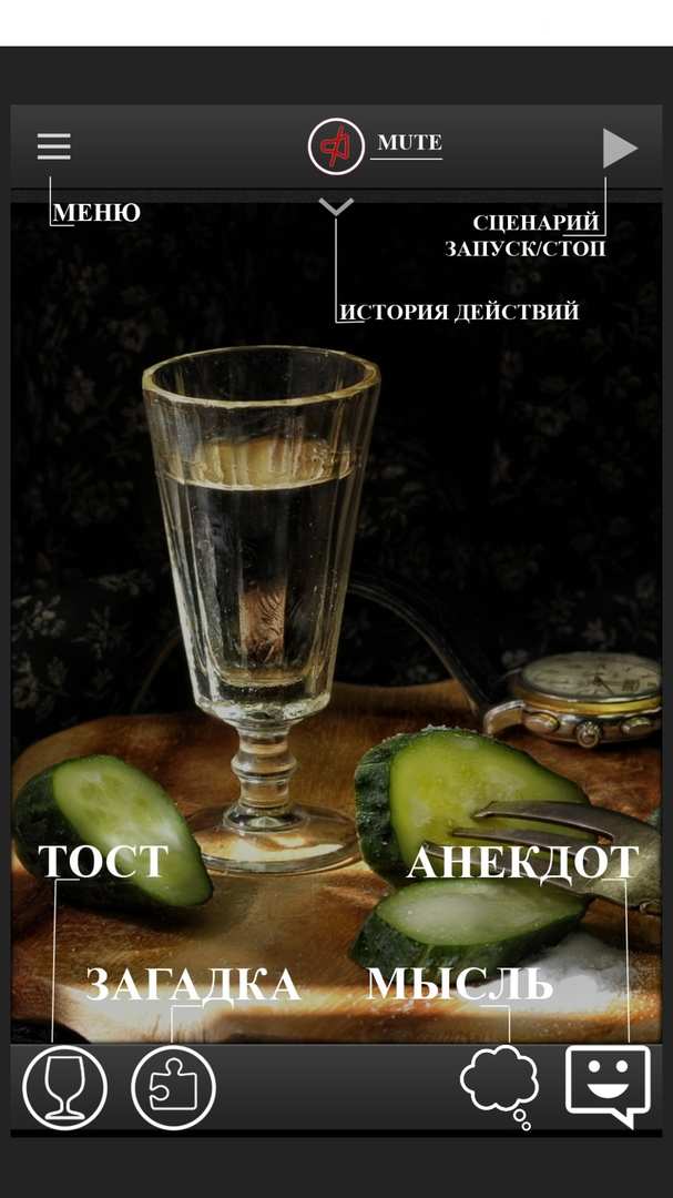 Если реального или даже онлайн-друга найти не удалось, поможет виртуальный тамада из приложения "Собутыльник 2.0" Он и тост скажет, и анекдотом поддержит, и историю из жизни расскажет, а главное, с ним невозможно поругаться. Единственный минус - этот супертамада не умеет говорить, все нужно читать с экрана. (GooglePlay)