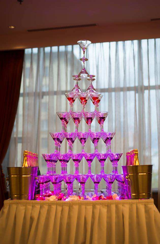 Часто на вечеринках в честь выпускного мы строим пирамиду из бокалов. Обычно она делается с шампанским, но для выпускных, мы берем вариант с лимонадом типа «Буратино» или безалкогольным шампанским они растекаются и пенятся не хуже игристого вина, и выпускники с удовольствием смотрят на пирамиду, и пьют лимонад. Ну и, понятно, с красивыми бокалами и коктейлями получаются отличные фото для выпускного альбома
