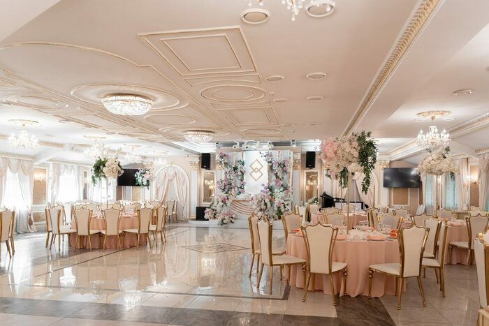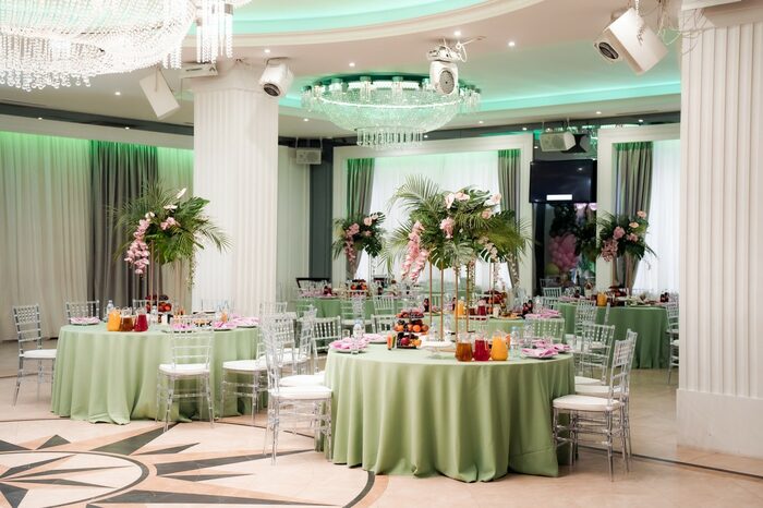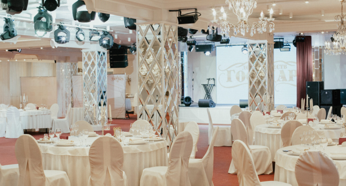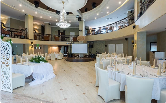 В светлом банкетном зале ресторана есть все оборудование для проведения мероприятия, включая музыкальное, чтобы заказчик смог пригласить диджея или музыкальных исполнителей. В ресторане работает отдельная банкетная служба, в обязанности которой входят обслуживание столиков, подготовка и украшение зала под запрос гостей. Персонал окажет индивидуальную поддержку каждому на всех этапах планирования мероприятия. Стоимость проведения свадебного банкета - от 2000 рублей на человека.