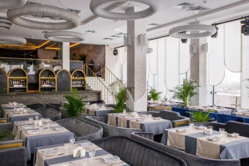 Уникальными залы этой площадки делаю прекрасный вид на город, вкуснейшее меню и атмосферный интерьер. Общая площадь помещения - 500 кв. м. Двухуровневый зал вмещает 120 персон. В нем для мероприятия подготовлено музыкальное и световое оборудование. Также есть VIP зона с камином. Летняя веранда на 120 персон с панорамным видом на Парк Победы идеально подойдет для празднования летней свадьбы. Двухуровневый караоке зал на 50 гостей подойдет для корпоратива и дня рождения. В зале есть танцпол и сцена для выступлений. Кухня площадки средиземноморская, а десерты и салаты - авторской кухни. Минимальная стоимость банкета - от 380 000 рублей.