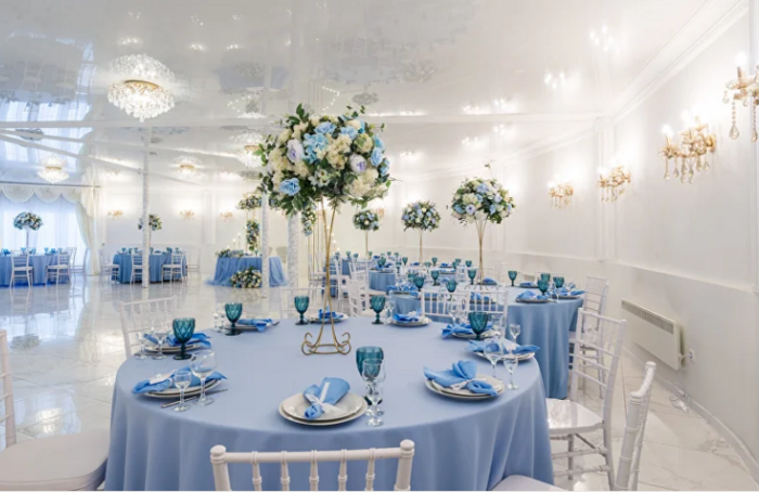 - Большой зал при банкетной рассадке вмещает в себя 150 гостей. Интерьер зала скромный, в голубых тонах, украшен прекрасными цветочными композициями. В зале есть отдельная зона для молодоженов.