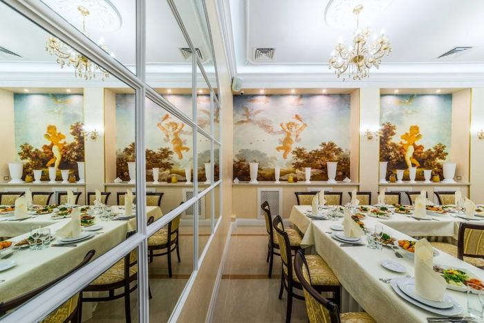 Ресторан предлагает своим гостям четыре банкетных зала, разных по дизайну и вместительности.