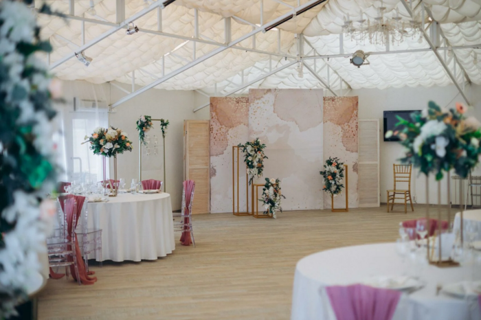 Большой зал вместимостью 75 гостей. Интерьер зала светлый с розовыми акцентами. Есть отдельное помещение для фотосессии или приема гостей.