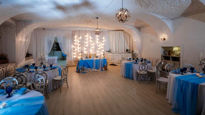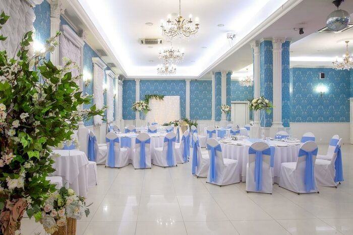 - Георгивский зал площадью 200 кв. м с террасой и детской комнатой. рассадка в зале может быть разная. Интерьер в бело-голубых оттенках - идеально для свадебных банкетов и юбилеев.