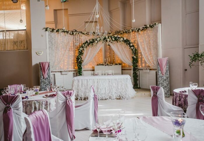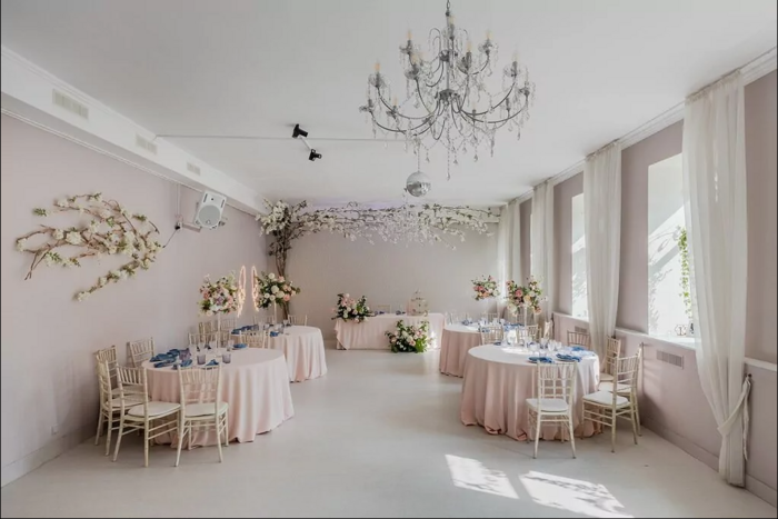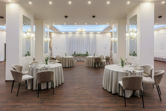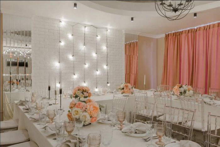 - Белый зал идеально подходит для небольшой свадьбы на 30 гостей. Интерьер в пастельных тонах с хрустальными бра на стенах и дополнительный свет на потолке сделают фото с мероприятия идеальными.
