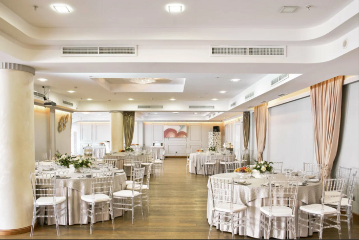Роскошный банкетный зал вместимостью 160 гостей с круглыми столами на 8 и 12 персон. В зале есть свой бар, сцена и все необходимое оборудование для проведения мероприятий высшего уровня.