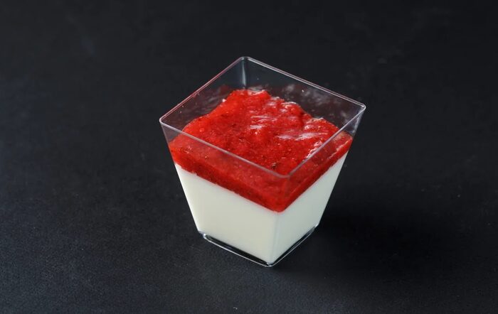 Необычное название этого десерта произошло от итальянского слова “panna cotta”- варёные сливки. При приготовлении этой вкуснятины сливки действительно варят с сахаром и ванилью, добавляя желатин. Подается этот десерт с различными джемами, ягодными и карамельными соусами. Например, наша компания предлагает вам попробовать панна-котту с клубничным соусом. Вы можете не переживать за целостность этого желе при доставке, ведь оно помещается в удобный стаканчик, и с помощью маленькой ложечки вы сможете насладиться его вкусом.