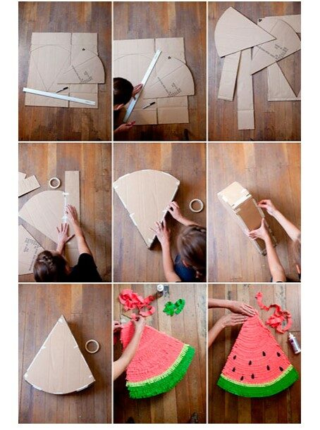 Вот, например, пиньята в виде кусочка арбуза на летнюю вечеринку. Наполнение может быть любое, от конфет до какой нибудь косметики, например, маски для лица. Конечно, для большего эффекта при ее разбивании добавьте к основному населению яркое конфетти.
