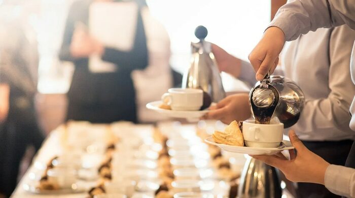 Для того, кто старается не употреблять кофеин, можно предложить зеленый чай или холодный свежевыжатый сок апельсина. Эти напитки очень бодрят. На столы так же нужно разместить воду газированную и обычную, хотя горячие напитки в меню приоритетнее.