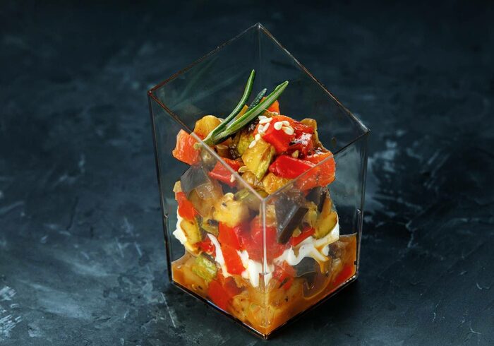 Салаты в стаканчиках или креманках не так популярны в непродолжительные перерывы. Но все же это очень удобный вид перекуса. Чаще всего выбирают “зеленые”, легкие салаты, но и традиционные подходят. Малый вес и порционность выгодны в финансовом плане и украшают столы.