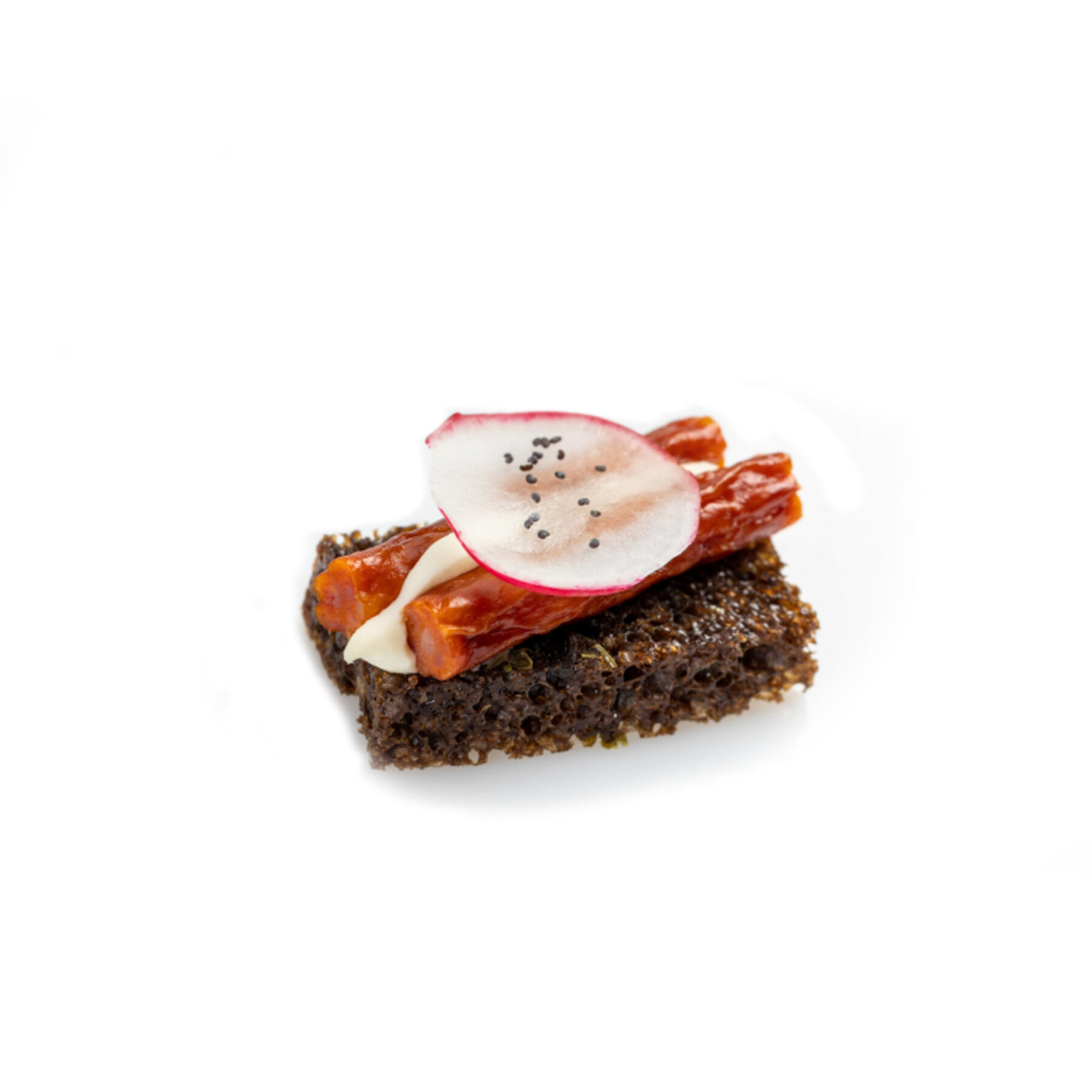 Шпрота на бородинском хлебе с маринованным огурчиком и перцем чили