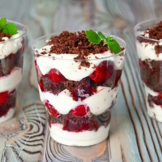 Состоит из шоколадного бисквитного теста, заварного крема, сочной вишни и взбитых сливок.