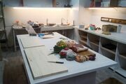 длинный и глубокий, у стены (330 см на 90 см.). + мойки и подготовительный железный стол сбоку. Подвижный остров 120х240 по центру.