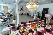 В Вашем распоряжении 1 деревянный стол на 10 посадочных мест, 5 дополнительных столов белых и 5 дополнительных чёрных столов