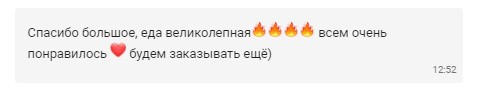 Наталья Борисовна: Спасибо большое! Очень выручили! Всё очень вкусно! Доставка во время! Я ваш клиент теперь постоянный!!!)