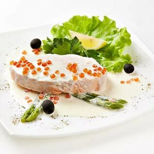 Форель, лимон, сливочный соус, икра красная соленая. 250 грамм