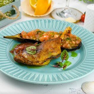 Утиная ножка, баклажан, помидоры, базилик, лук, вино красное, орегано, чеснок, соус бер-руж.