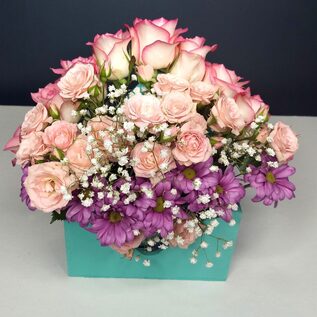 Розовые розы, кустовые розы, эустома, альстромерия и не только входят в состав прекрасного букета Фантазия.