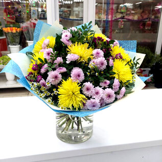 Букет Солнечный лучик из желтых и фиолетовых хризантем. Отличный весенний букет на день рождения.