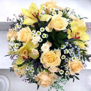 Букет из орхидей, роз, альстромерий и ромашек подарит вашему дню и дому прекрасный аромат.