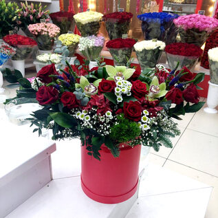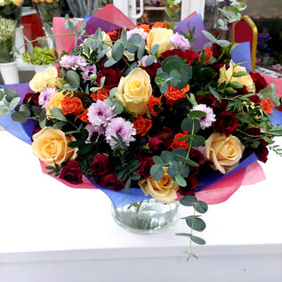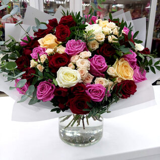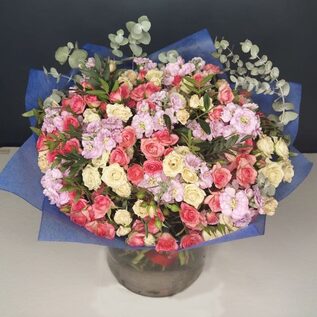 Яркий букет из кустовых роз дополненный зеленью эвкалипта, будет отличным подарком практически по любому поводу – на день рождения, профессиональный праздник, семейное торжество.