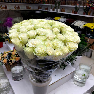 Мондиаль - роза белого цвета, имеет практически идеально прямой и достаточно крепкий стебель, с минимальным количеством шипов и достаточно густой блестящей листвой необычного темно-зеленого цвета. 51 роза в букете. Упаковка на ваш выбор (цвет бумаги и ленты), + 200 руб. к стоимости букета.