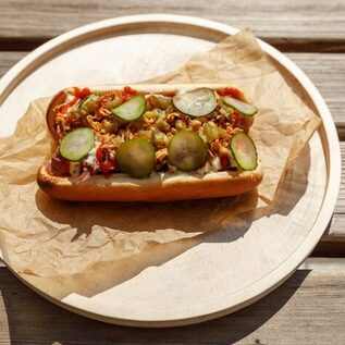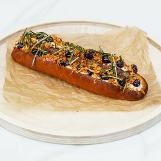 Хот-дог с рубленой говядиной, трюфельным маслом и черной смородиной