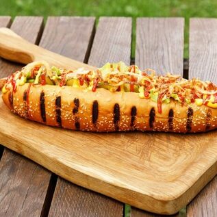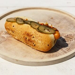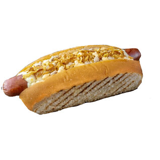 Хот-дог в классической булочке с квашеной капустой, луком, горчицей и майонезом. 1 шт.