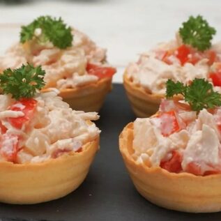 Тарталетки: с креветками и сыром, с курицей, с рыбой и маслинами.