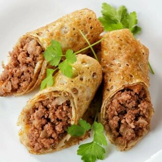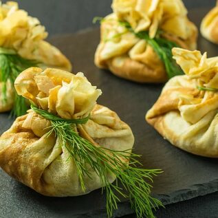 Холодная закуска, в составе которой блинчики, семга, сыр Филадельфия, зелень.
