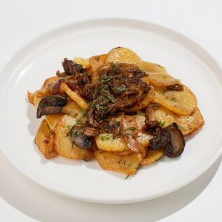 Стейк из свиной шейки с соусом из лесных грибов и картофелем бэби