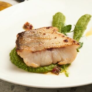 Утиная грудка жареная на гриле с клюквенным соусом и красной грушей