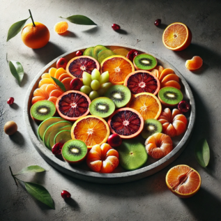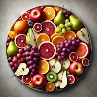 Ассорти сезонных фруктов и ягод с присыпкой сахарной пудры. 600 грамм