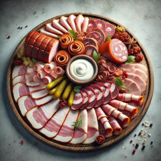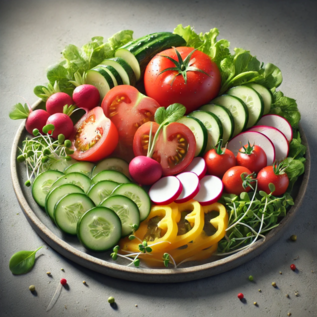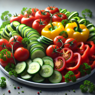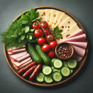 Твердый сыр, ветчина, свежие огурце, веточка помидоры черри, петрушка, укроп, колбаса копченая. 300 грамм