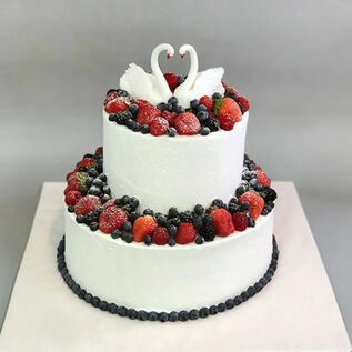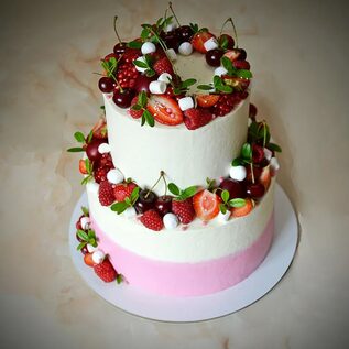 Торт с тремя нежнейшими шоколадными муссами на тонкой прослойке воздушного бисквита, увенчанный шоколадной глазурью и ягодным декором.