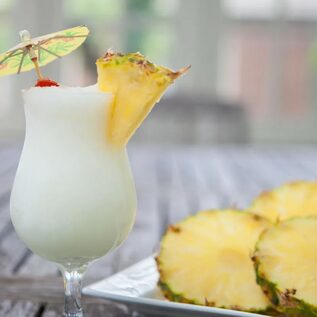 Ананасовый сок, сливки, ледяная крошка, сахар, кокосовая или шоколадная крошка для украшения, кружки ананаса