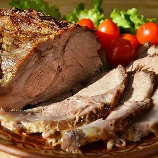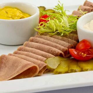 Холодная закуска в составе которой нарезанный отварной говяжий язык, подается в стол с хреном и горчицей.