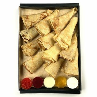 12 блинов с начинками (в стаканчиках): мёд, сгущенка, сметана, домашнее варенье, красная икра (имитация).