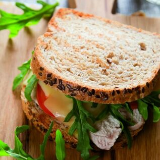 Хлеба, филе индейки, помидор черри, руккола, сыр.
