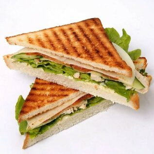 Хлеб тостовый, ветчина, сыр, острый соус, помидор, лук, сливочное масло, салат-латук. 150