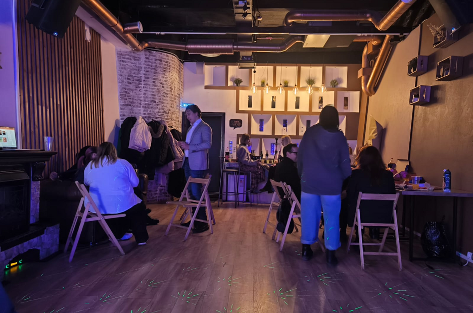 Камин, гримерное зеркало с димируемым светом, два кожаных дивана Chester и множество элементов декора придадут уют и приятную камерную атмосферу вашему мероприятию, а наличие профессиональной звуковой и световой техники, а также онлайн-караоке - помогут создать веселое настроение. Площадка расположена на первом этаже. Также нашим преимуществом является наличие собственного санузла.